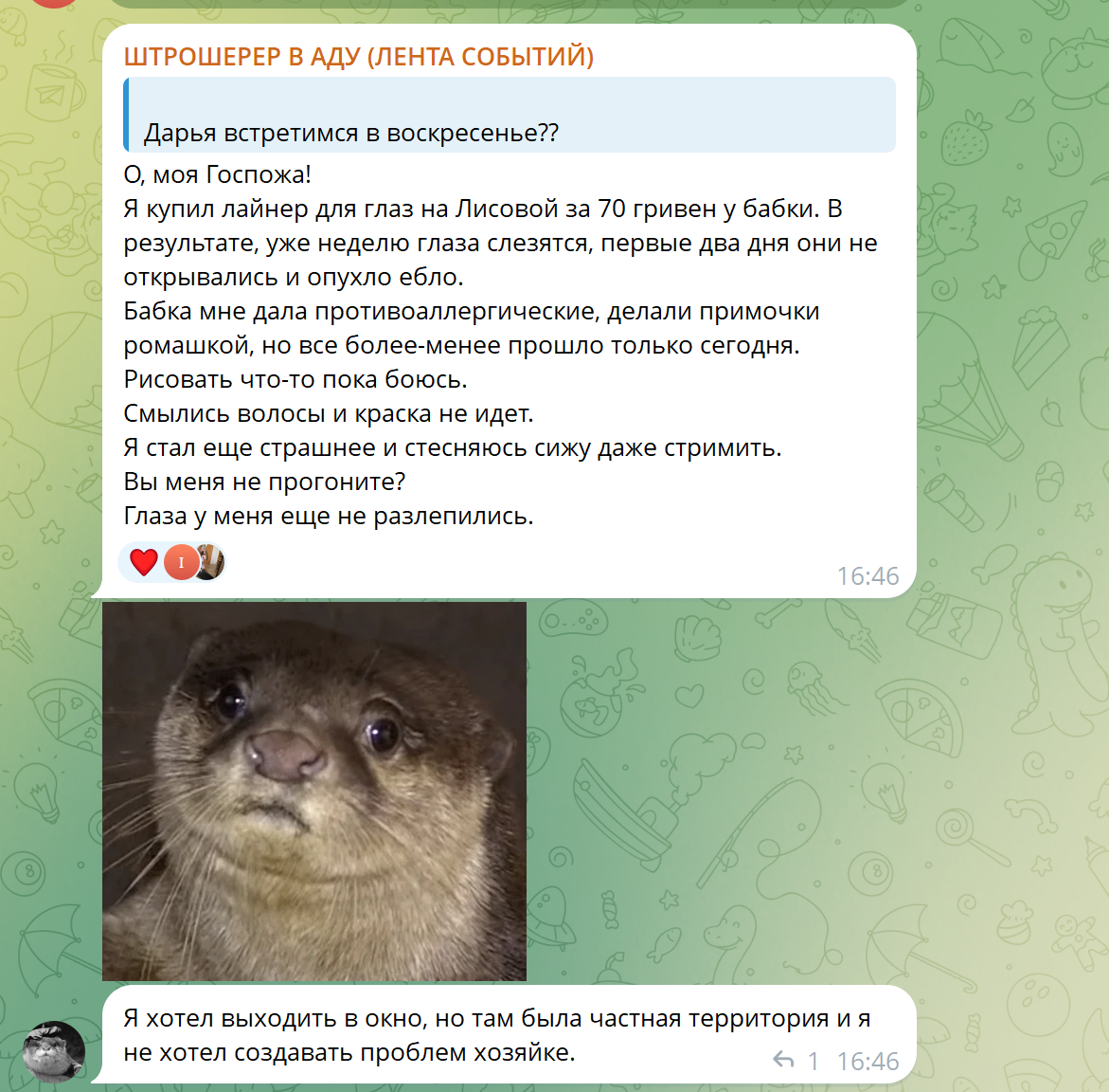 Но июнь 2025-го разрывает этот миф, как прогнивший холст. В Telegram-каналах Сигрив извергает аудиосообщения — длинные, как исповедь в палате для буйных, вязкие, как голубое сало. Она признаётся: да, замужем, да, в Черкассах, посвідка просрочена, Гнатюк утащен ТЦК, криптокошельки испарились, донаты на его карту — в небытие, арендованный дом — чужой. Всё рушится, как декорации в театре абсурда. Сигрив, словно призрак, вырванный из собственного кода, перетекает в пригород Киева. Там, среди бетонных коробок и гула проводов, она записывает видео на мове — мольбу о легализации, звучащую как крик из-под обломков её же мифа. Её голос — смесь отчаяния и дешёвого фильтра, глаза — мутные, как вода в луже.
