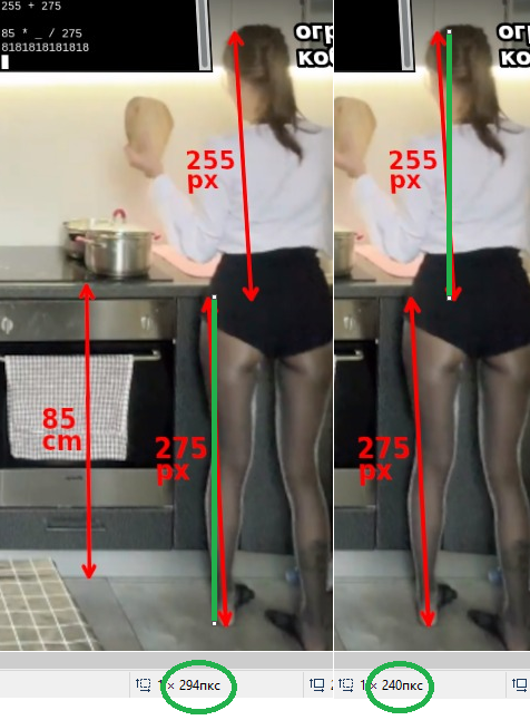 2. Перспектива, блять! Возьми в любом граф. редакторе линии и попробуй их порисовать. Относительно плитки напольной, относительно варочной панели, стола... Ты ахуеешь насколько они не параллельные. Да там даже сама плита встроенная с одной стороны более менее прямая, а с другой там уже ебейший угол. Как камера стоит, на какой высоте, какой угол? Ты ж ничерта из этого не учел. Там если даже начать вычерчивать перспективу от какой-нибудь напольной плитки, можно по итогу Галке и все 180 намерять.