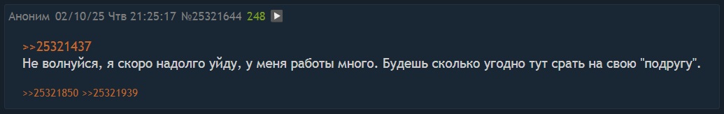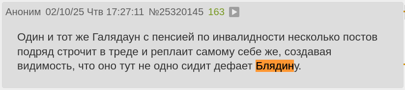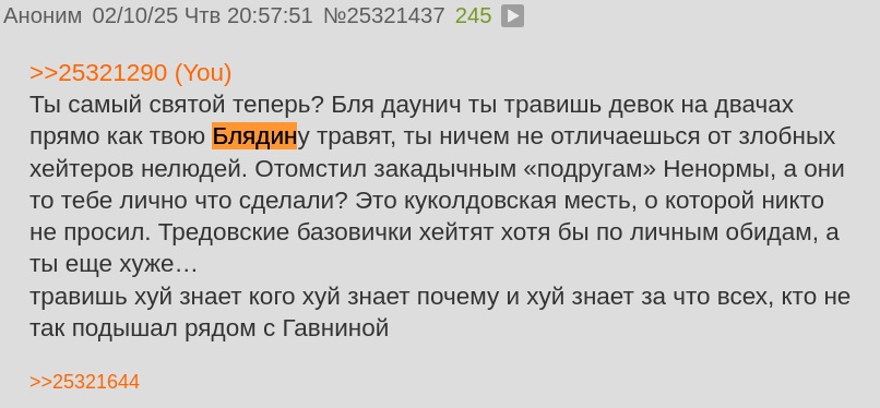 >>25334562 → В каком манямирке находится галядаун, который это расписал? В его представлениях у Галки подруг нет из-за зависти, непонятно чему правда ей завидовать, дворцов и черной икры не видно, но довод что она как подруга хуйня не приходит на ум. У нее не только подруг нет, если не заметил, в целом никого, друзей тоже нет, без чатерского терпильного симпозиума останется совсем одна, и мужика тоже нет по тем же причинам, а причина в том, что Копроселова проженная шизоидка с гнилой сущностью, она не могет в построение нормальных отношений, это ближе к обидной правде, которая глаза мозолит галядаунам, кроме них терпеть социопатку никто не хочет