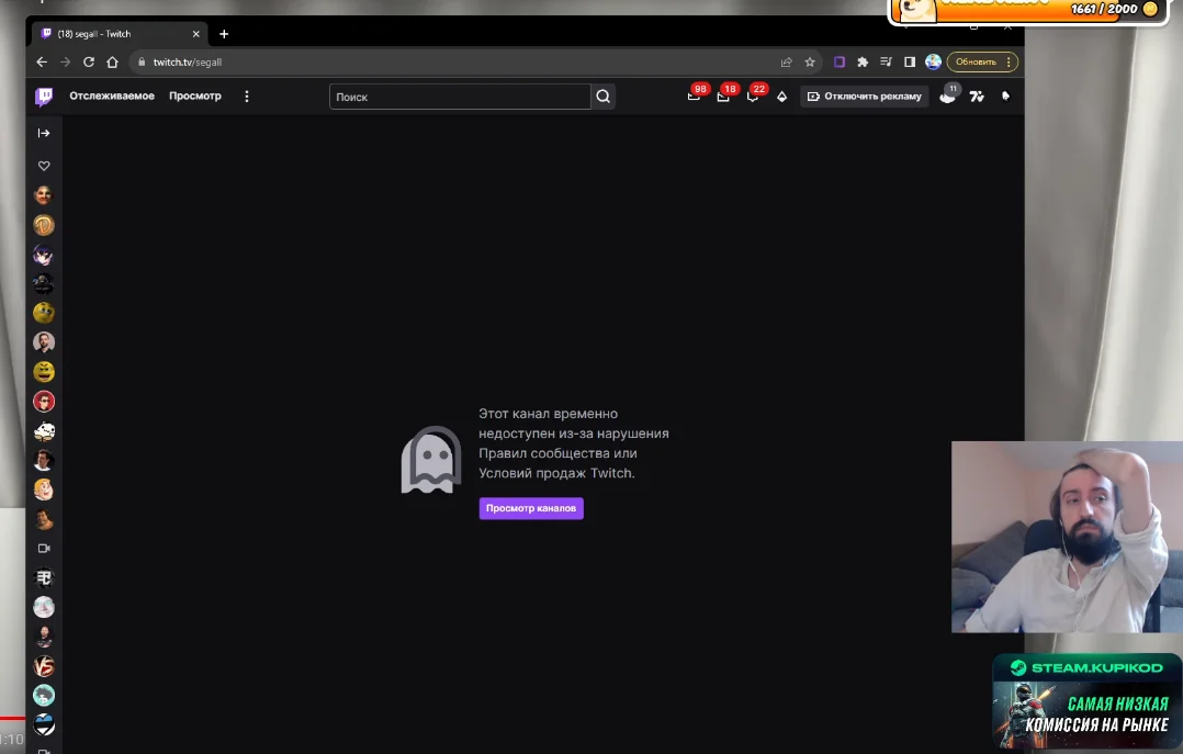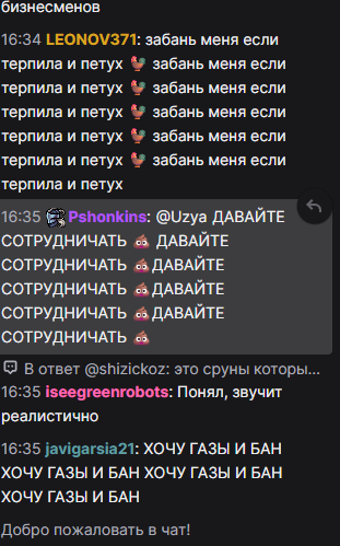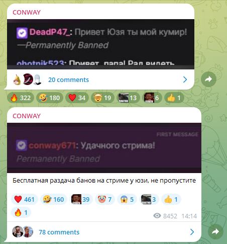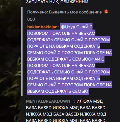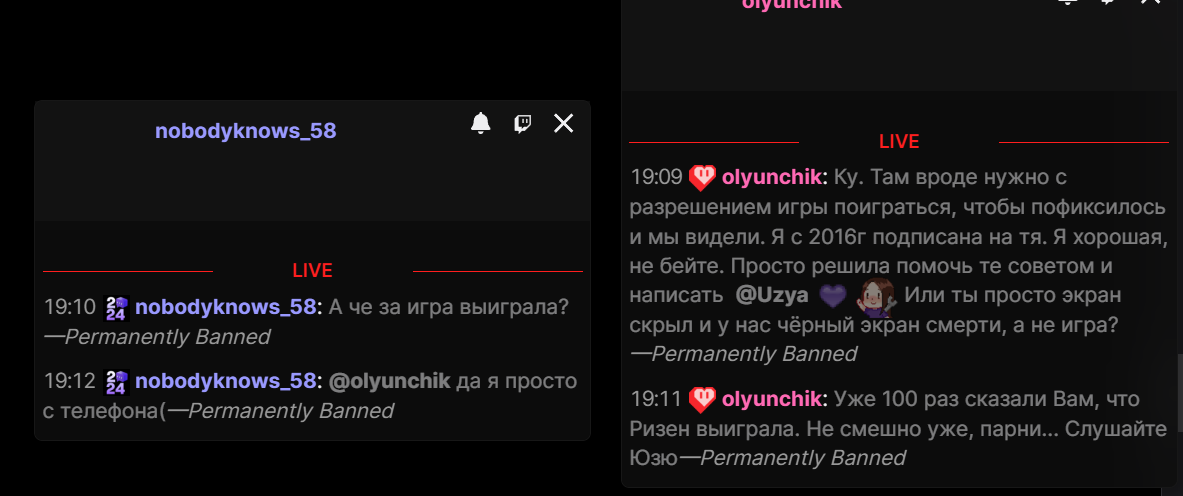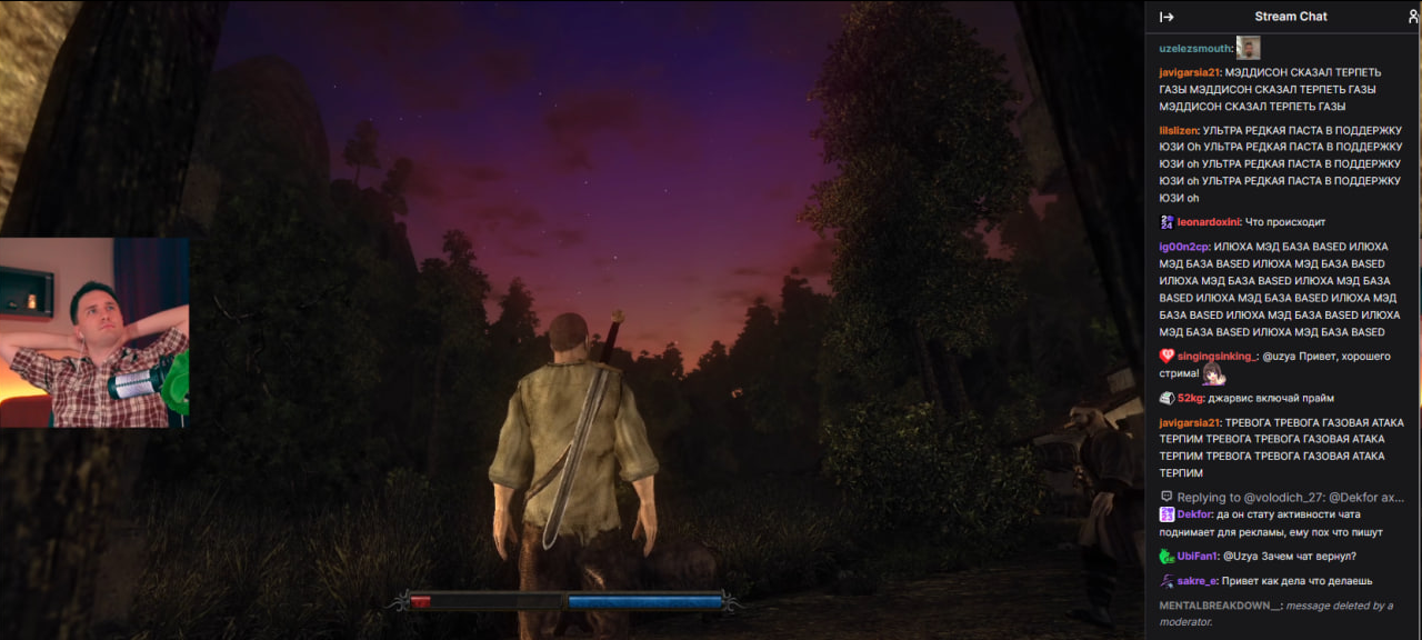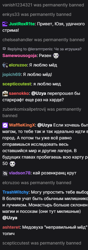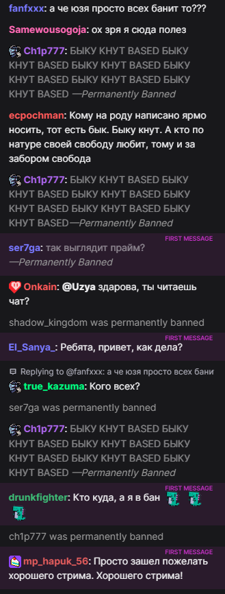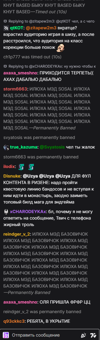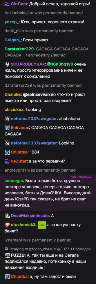 Бля я не могу. это 100% какой-то пятислойный перформанс. Как только он запустил игру баны прекратились. Сейчас свернул "настроить звук" и еще +50 банов в чате. То есть он сам руками сносит, даже модеров нет (он их всех снял). При этом делает вид, что все совершенно нормально на стриме.