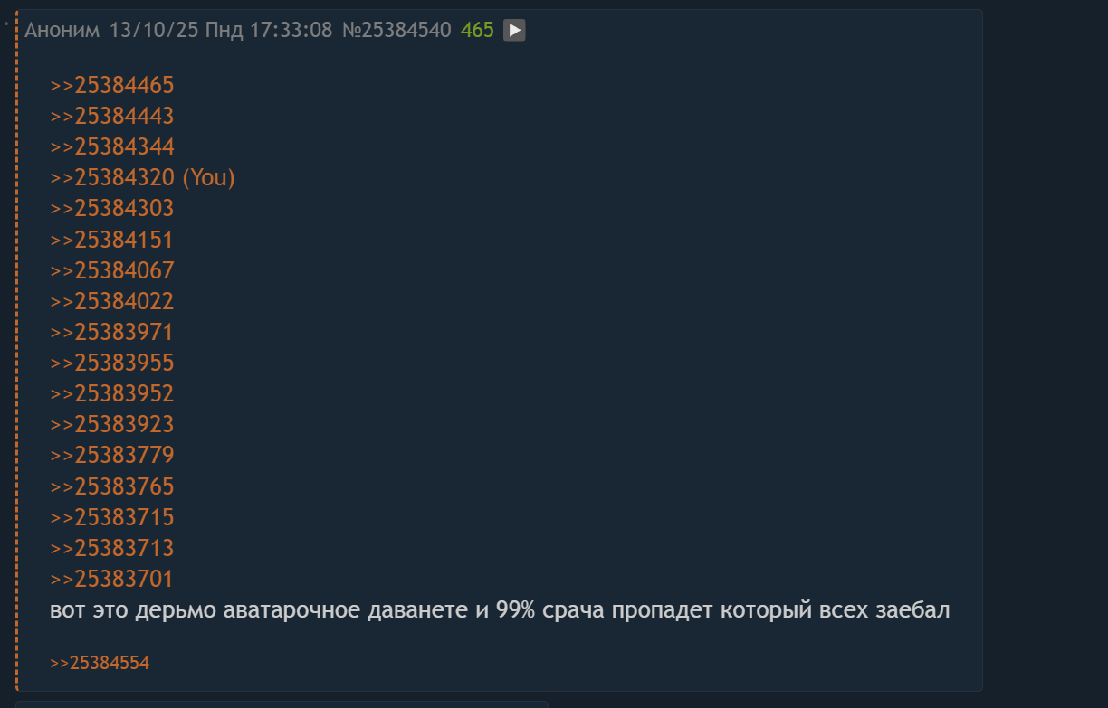 Во-вторых, заметьте как вайп этим додиком происходит периодически. То есть это не один какой то ебланчик вроде ненормера или хамитовца серят в тред безответно. Нет, вот сидят тут анончики, обсуждают билды в скайриме и тут вдруг НА НАХУЙ, минуту спустя все обсуждают додика Юзю, как будто там вообще есть что обсуждать.