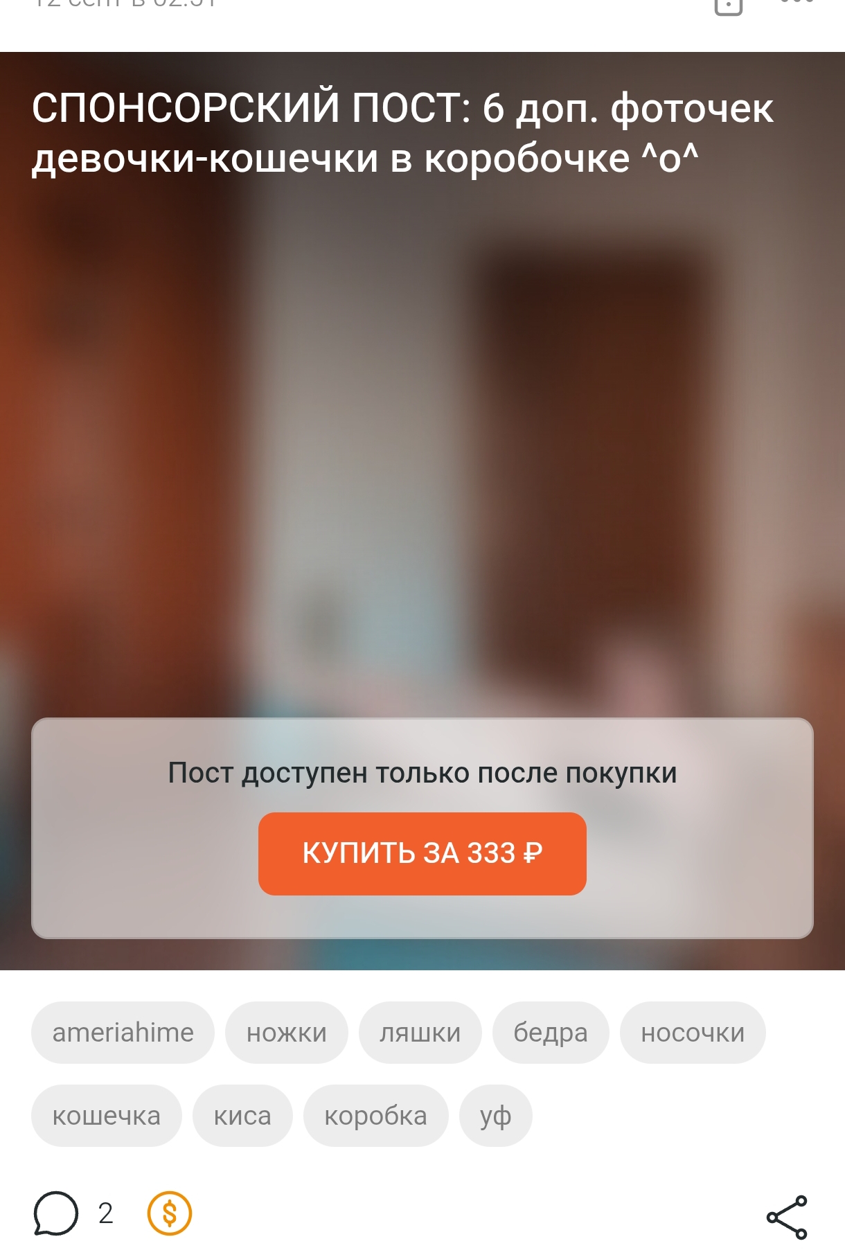 Короче, это дно. Итак, раньше фоточки обычные, цена номинальная, все для фана, а если хочешь - поддержи. Ну и какая-никакая тематика, потому что стыдно деньги брать за так. И вашим и нашим, тупо мини фанлуб. Но выж пидорасы, выж говно все, поэтому отныне косарь за пару всратых фото, а всем остальным хуй, не чувствую вашу поддержку, уебаны. И прикол в том, что всякие бляди с онлика за эту сумму жеппу рвут, худеют, красятся, косплеются и конкурируют между собой. А здесь что? Жирная решила, что добровольцев мало и надо доить более прямо. А кто ради хорнятины, ну он урод, но за деньги да? Тогда к чему были все эти подходы про то, что бустя для себя, это ничего не значит и не является заработком? Кто сколько хочет, ради поддержки. Ух.