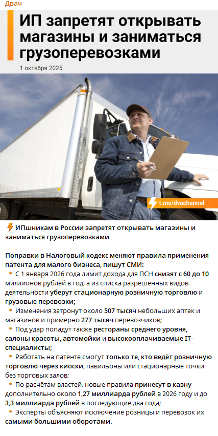 >>25314769 >ИП Мауре пизда пришла? Полная и безоговорочная. Сначала пизду отчекрыжили Чмогруре по самые уши, а теперь отчекрыжат весь бизнес. И даже зелеными нитками не зашьют. >>25314806 >>25315129 >>25316139 Хехехе. Речь про патент в статье, а изменения касаются всех ИП и в том числе на УСН. Тухлопритон будет закрыт, потому что: с 26 года лимит по ИП будет 10млн/год. Для ИП 6% УСН это = выручка. То есть, если у Чмогруры выручка по магазину 833к/мес, то она попадет под НДС. А если Чмогрура на патенте, то или закрывать тухлопритон с 1 января, либо преходить на УСН и нанимать бухгалтера, а также вести учет. Чего сейчас Чмоль не делает. Скорее всего, сидит на патенте. Но и это еще не все. Идути разговоры о том, что лицензию на алко ИПшникам отменят. Вроде бы у Угловой пож это дело номинальная ОООшка есть, но и эта ОООшка попадет на НДС в 26 году. Спасет Чмогруру только то, если у нее маленькие обороты и она не на патенте. Поглядим. Нокак же приятно будет, если ее обезжирят.
