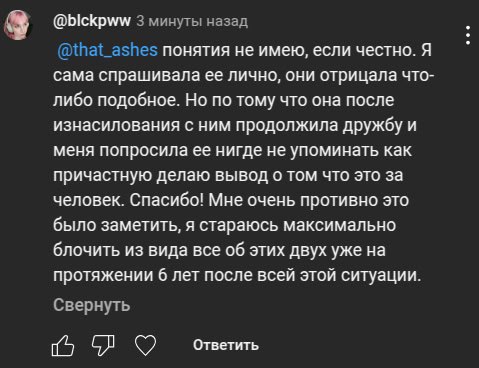 А что касателно поебанной жизни парня, посмотрись в зеркало! Мне всегда было похуй, как она выглядит. Довелось познакомиться с ее стримами через Куваева, когда интересовался Японией активно. У нее раньше много ирл-стримов из Японии было, собственно, по этой причине ее и начал смотреть. Несколько лет ее вообще не смотрел. Интерес опять подогрел аудио РВ. От него даже о тредах в «Двачах» узнал. Что касается остального, заебало читать ваши небылицы и бред. Мне на ее личную жизнь поебать откровенно. Какая она там за пределами стримов — тоже похуй. А то, что пишу, что видео в ирл, так это так, енто уже ваше дело — либо принять эту реальность, либо находиться дальше в мире грез.