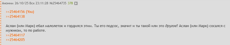 Аслан (или Марк) ебал малолеток и гордился этим. Ты его подсос, значит и ты такой или это другое? Аслан (или Марк) сосался с мужиком, то по работе. >>25464117 >>25464205