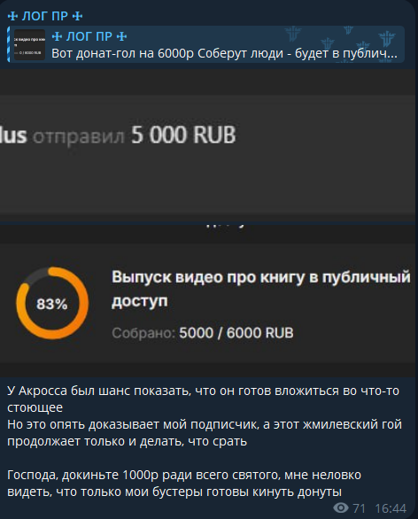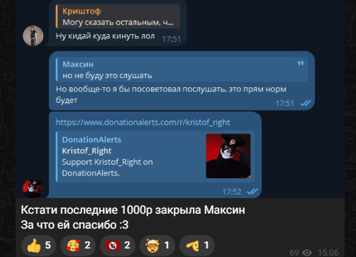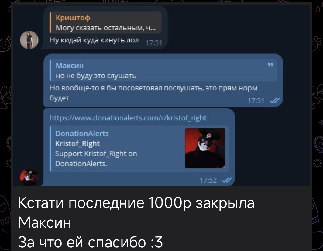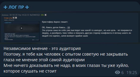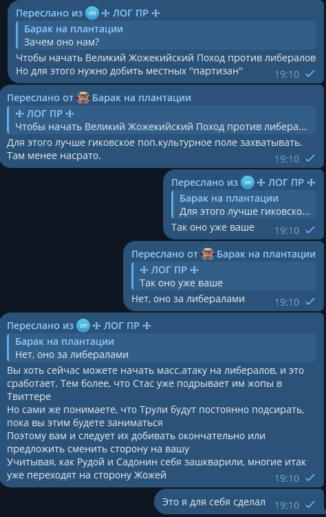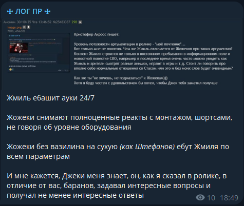 Дальше всё по учебнику, как полагается каждой микро-селебе из околополитического болота, завёл личный шизо-чатик в телеге. Там он круглосуточно заливает поток сознания — от нытья про тян (с акцентом на вечную драму с бывшей Данилинга) до тяжёлой геополитической шизы про будущее России. В довесок приплетает андеграундные кружки уровня Светова, Юнемана и прочих Жожеков, чтобы выглядело солидно.