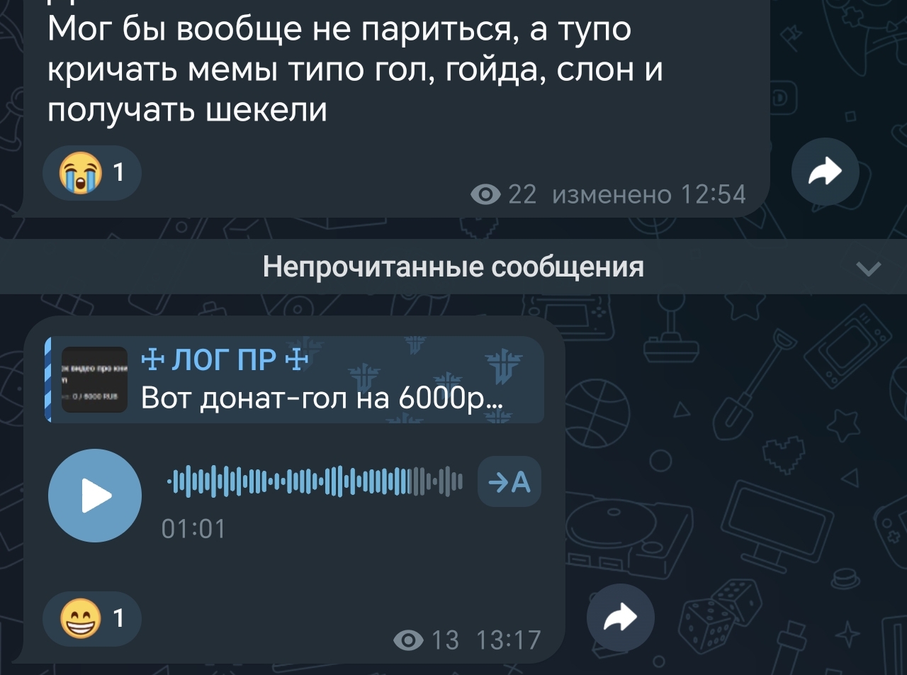 На своих стримах либо смотрит видео, которые ему заказывают два с половиной калеки, и иногда играет в хойку и майнкрафт, ну и выкладывает реакции на порнофильмы на свой тг канал