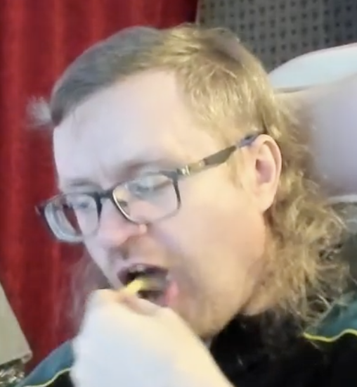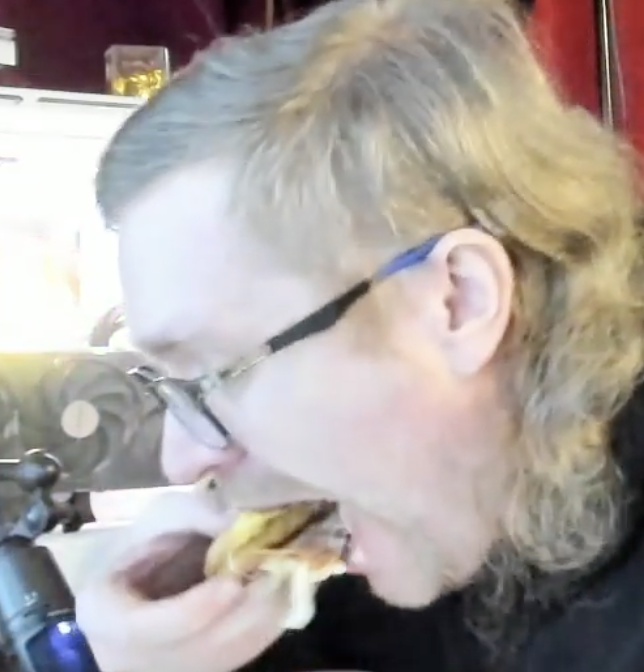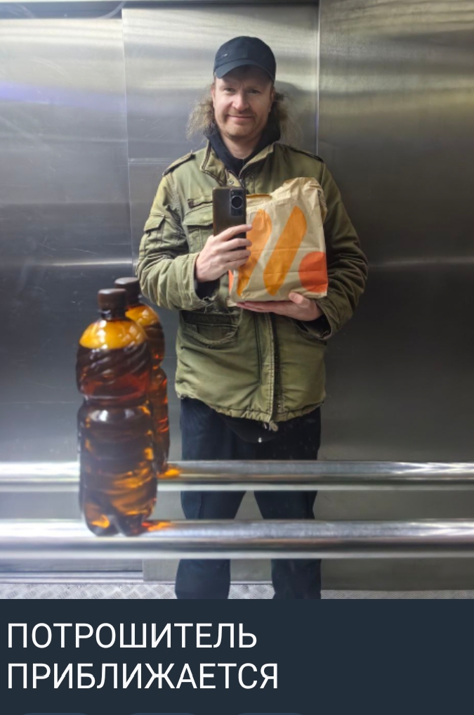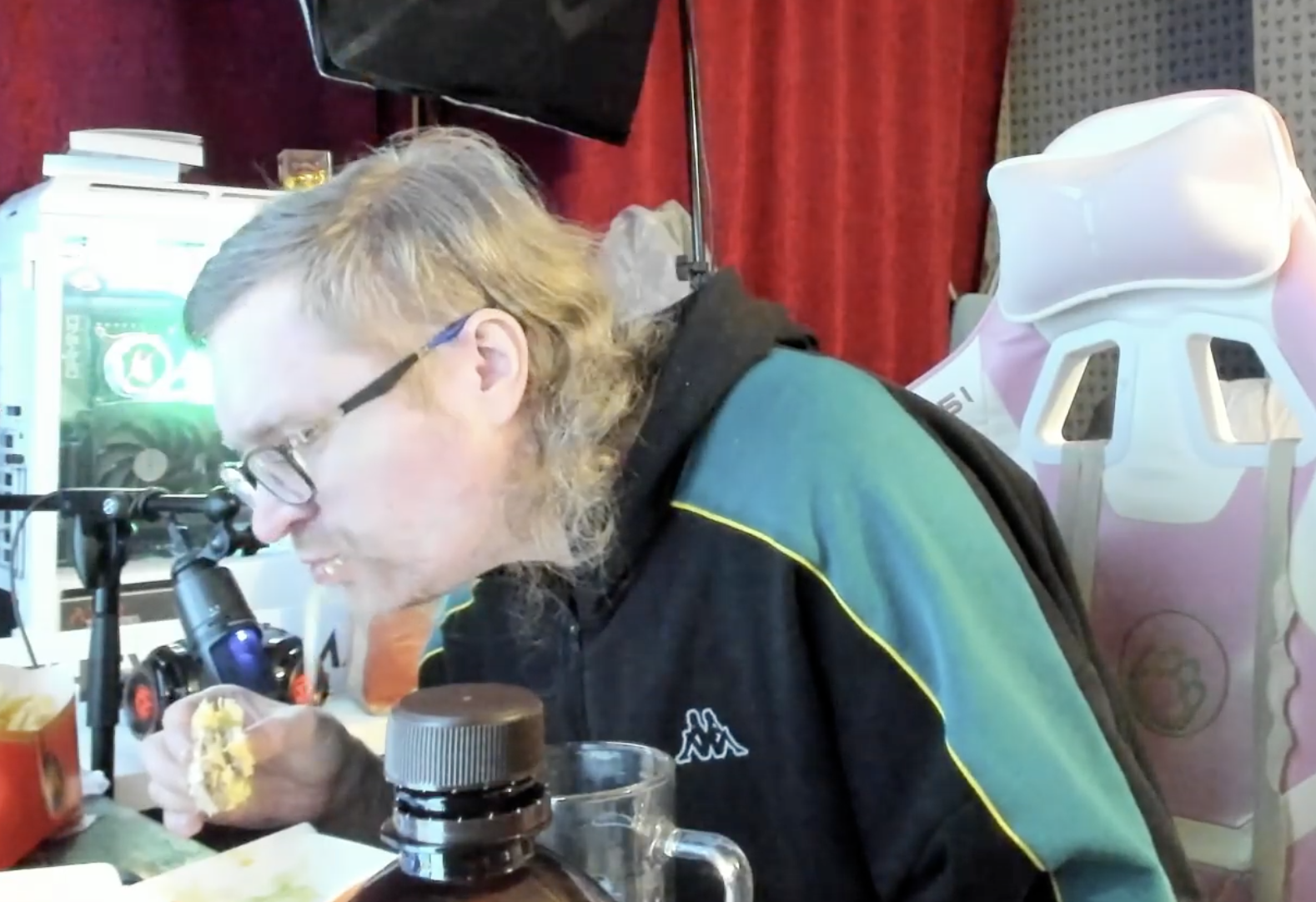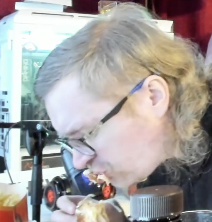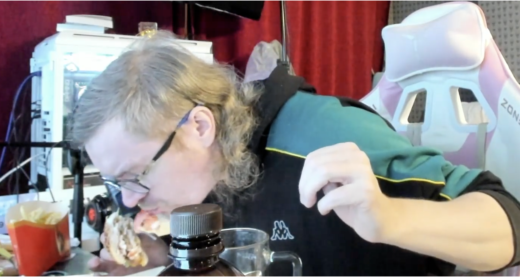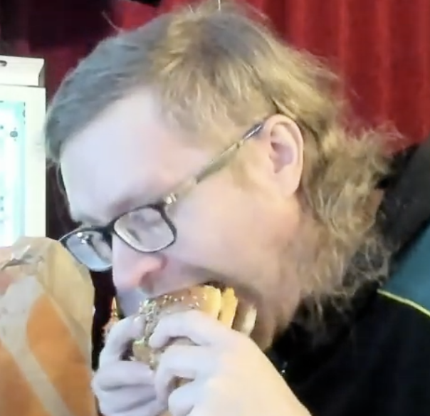 Полагаю, можно смело предположить, что у пациента в наличии патологическая жадность и неуверенность в себе. Свои проблемы он пытается компенсировать фастфудом и пивом, что приводит только лишь к ухудшению общего состояния. Исключительно в медицинских целях рекомендую обратить внимание на то как он жадно впивается своими кривыми зубами в бургер, а то и просто пытается засунуть еду в себя целиком.