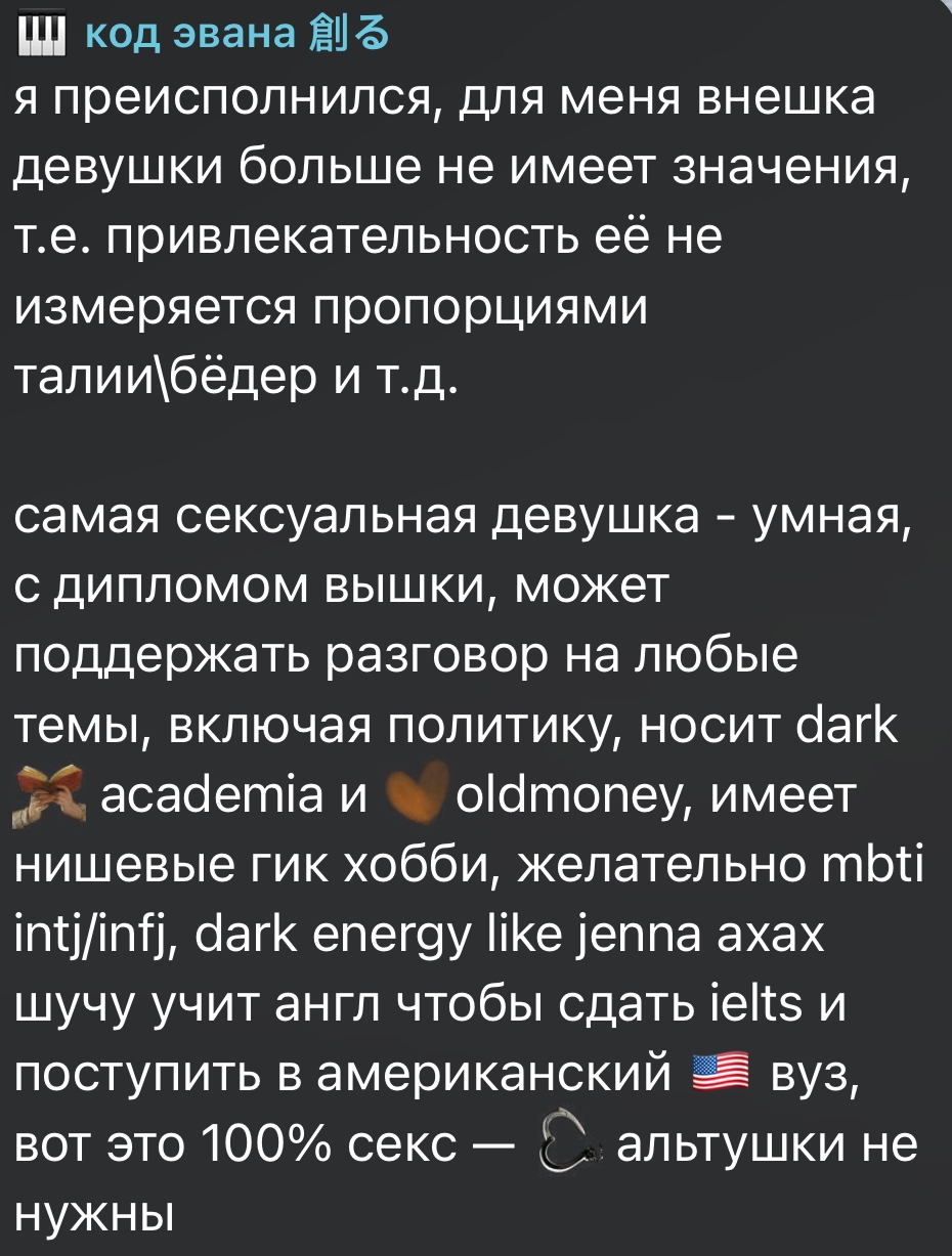 >>25578639 Что ты пытался донести этими скринами? Алёна, парень, скрины за разное время - везде контекста нет. В четвертом это тоже что, доказательство того, что не солевая? Или может просто прикол, или может её модер написал, что имел доступ к акку? Что ты пытаешься донести, что она не девственница или что потаскуха? У тебя не получается, как и не получается считать, обиженный бывший симп >>25578727 А эта борода обиженная откуда вообще может знать что-то достоверно? Используется как аргумент, но по факту просто тянутся к авторитету для даунов такие же дауны, веря на слово во всём.