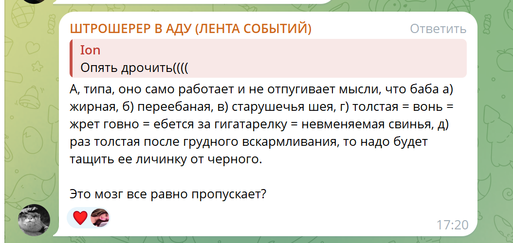 У меня тут тоже собственный ад, под оземпиком вообще не могу нормально просраться, теперь каждое утро микроклизма, такая же часть утреннего ритуала, как душ и чистка зубов. И вот значит залил я себе в анусай, лежу на животе, на мониторе играет последний видос Настасьи Сергеевны (это на которую делала обзор неназванная немецкая философиня), пытаюсь выждать 5 минут, чтобы твердый кал размок, понимаю, что не сдюжу; пытаюсь выждать хотя бы минуту - не, вообще никак; сдаюсь, бегу в сортир (на фоне крики Настасьи Сергеевны "МНЕ СТОЛЬКО ГОВЕН В ЧЯТЕ ПАНАСТАВИЛИ!") , добегаю, сажусь - и в тот момент когда от жопы до сиденья остаётся добрых полметра из меня выбивает под напором сперва воду а потом и первый снаряд, в голове мутится, я слышу разговоры спецов из ситьюейшн рум "дома из динамита": "object goes suborbital", "inclination is flattening", "this is what we do, sir!". Теперь сижу, страшно встать и посмотреть на дело жопы своей. Отмывать это все до обеда (