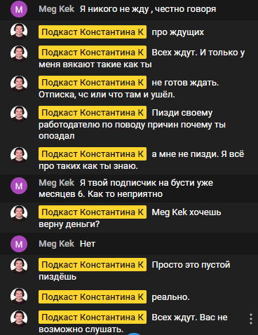 А по теме скажу так - хватит тут врать что аудитория кадавра сплошь успешна и состоятельна, портреты этой аудитории мы уже видели выше по треду, от них так и веет "успехом". Скорее, как правило, это нищие люди с кучей проблем и не только в финансовом плане но и в ментальном, что неоднократно демонстрируется в простынях этих донатеров. Люди которые легко ведомы и впадают в зависимость от унижающего их лидера