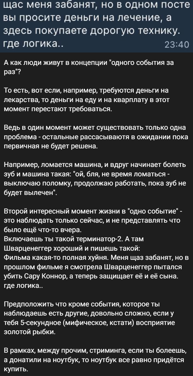 Оказалось что человек смотрит на мир шире отказываясь жить в концепции "одного события за раз". >>25600927 Во как, шах и мат, аноны! Против такой аргументации не попрешь.