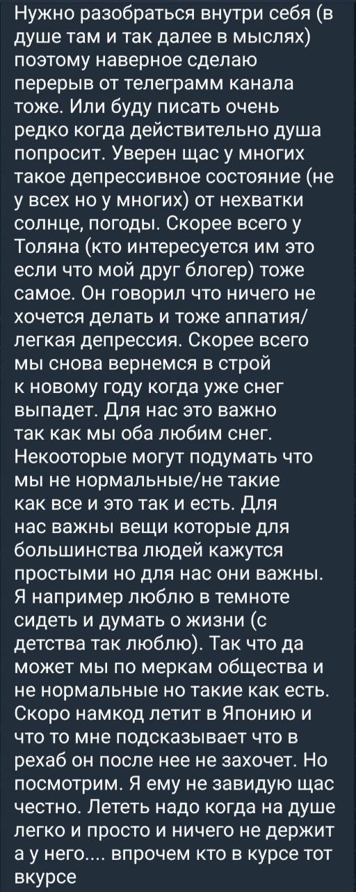 Ребята, хватит пургу гнать не по теме, давайте обсудим Анатолия Маркина, он же Linkin Simpson Давайте подискутируем на тему того, почему его нет в интернет пространстве уже больше месяца, а если быть точнее с 10 октября 2025 года, что может быть с ним или возможно осложнения с ногой Елены, как вы думаете?