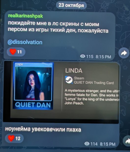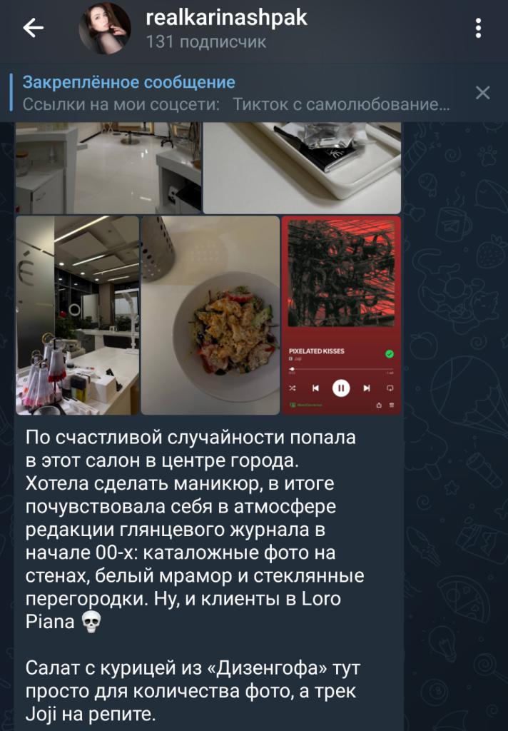 >>25598542 >Главный редактор журнала — Дарина Алексеева, подруга Потупчик и автор крупного телеграм-канала о культуре и светской жизни «Бахчисарайские гвоздики» Карина в своем паблике прокоментила фотку из 1997 года, а через 5 минут в канале главредакторши москвички появился пост с той же пикчей, но другой подписью. Получается главред подписалась на микроканал Карины и скопировала его себе? А может Карину поставили админить этот канал?