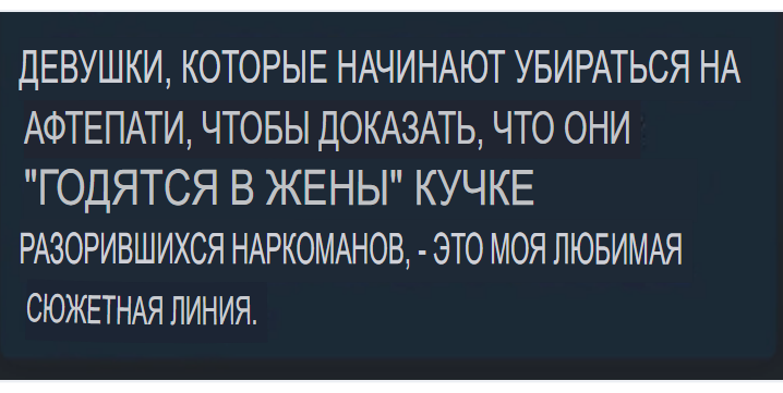 >>25507281 Да, я помню, она рассказывала как фак мрак напивался с друзьями а она бутылки собирала. если быть точнее, стала рассказывать уже после того, как он нашел новую тян, а до этого канючила: ЭТО МОИ ЛУЧШИЕ ОТНОШЕНИЯ, ТАК ХОРОШО БОЛЬШЕ НЕ БУДЕТ