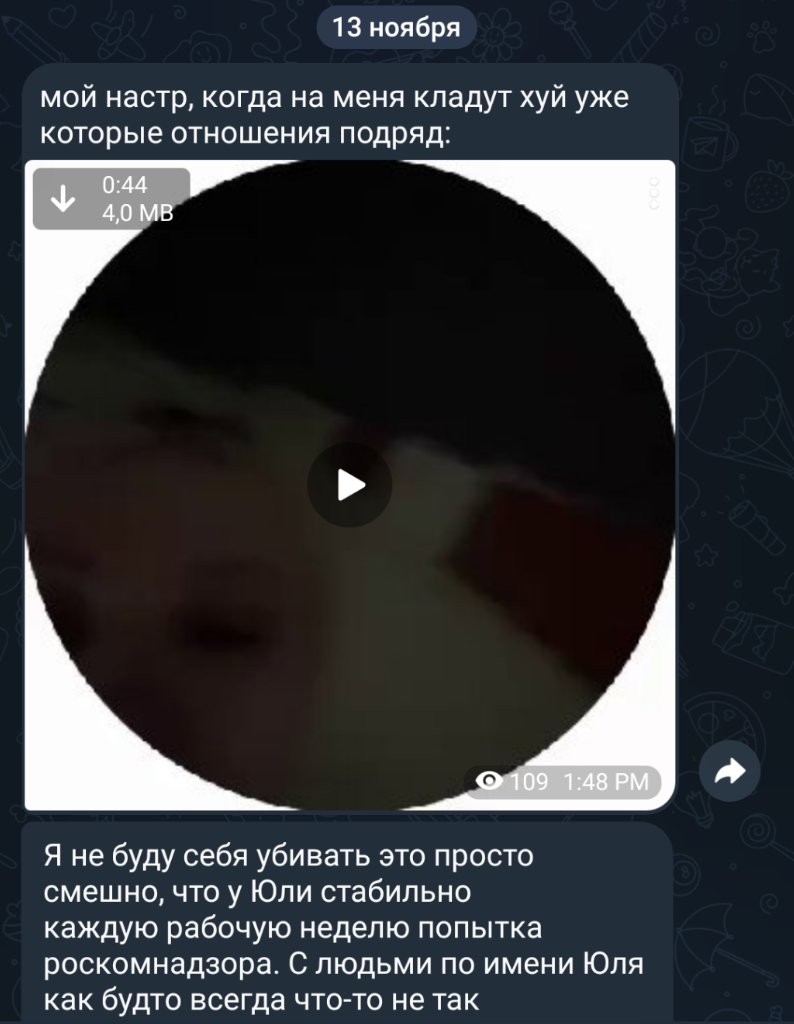 >>25293524 Ой, ошибся, ныл Бекзотик криптомошенник когда она ему якобы изменила в Питере, а он жил у неё дома, узнал это и разнёс ей хату и забрал комп который подарил. А факмрак это еще её один бывший, которого она бросила в Сербии. Она с ним кстати целовалась в каком-то клипе Тони Резника. То есть целовалась в клипе своего будущего парня со своим бывшим.
