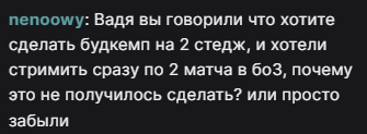 Вадос вообще не раскрыл купленный мажор. Мог бы делать 2 стрима, потому что там 2 параллельных матча идут, мог бы студию или буткемп сделать, какие-то активности кроме розыгрышей ебучих ножей и т.д.