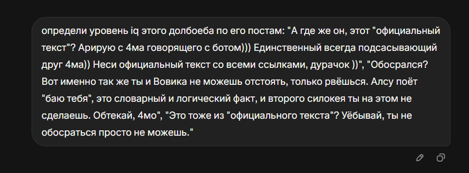 >>25692201 Тебе уже показали уровень: >>25691520 >>25691990 >>25692006 >>25692102 >>25692154 Разъебав тебя с твоим ботом как щенков)) Теперь у тебя два варианта: копротивляться дальше или извиниться перед всем тредом за шитпостинг. Уверен что второй вариант не для 4ма )))