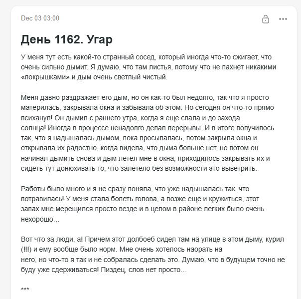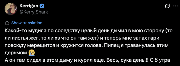 Официант: какой-то мудила по соседству с яной целый день дымил в ее сторону (то ли листья жег, то ли хз что он там жег) и теперь яне запах гари повсюду мерещится и кружится голова. Пипец она траванулась этим дерьмом. Поэтому наше говно из горшка она есть не будет.
