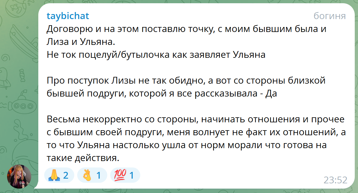 Галя и Лиза знали масштаб страданий Тайбисокс и всё равно приняли "подкаты". Часть того самого стада, что пожирает своих. Две пизды повелись на провокацию 10/10 ёбыря провокатора. Даже если Тайбисокс говорила им, что отпустила, каждый понимает, что такие вещи не проходят мгновенно. Их сложно за это винить, это просто две пизды, одна из которых - ебанутая, без эмпатии, которая снимает скальп с кроликов, а вторая вообще вебкамщица. Ожидать понимания ситуации от них со стороны Тайбисокс - ошибка, которую она теперь очень хорошо усвоила.