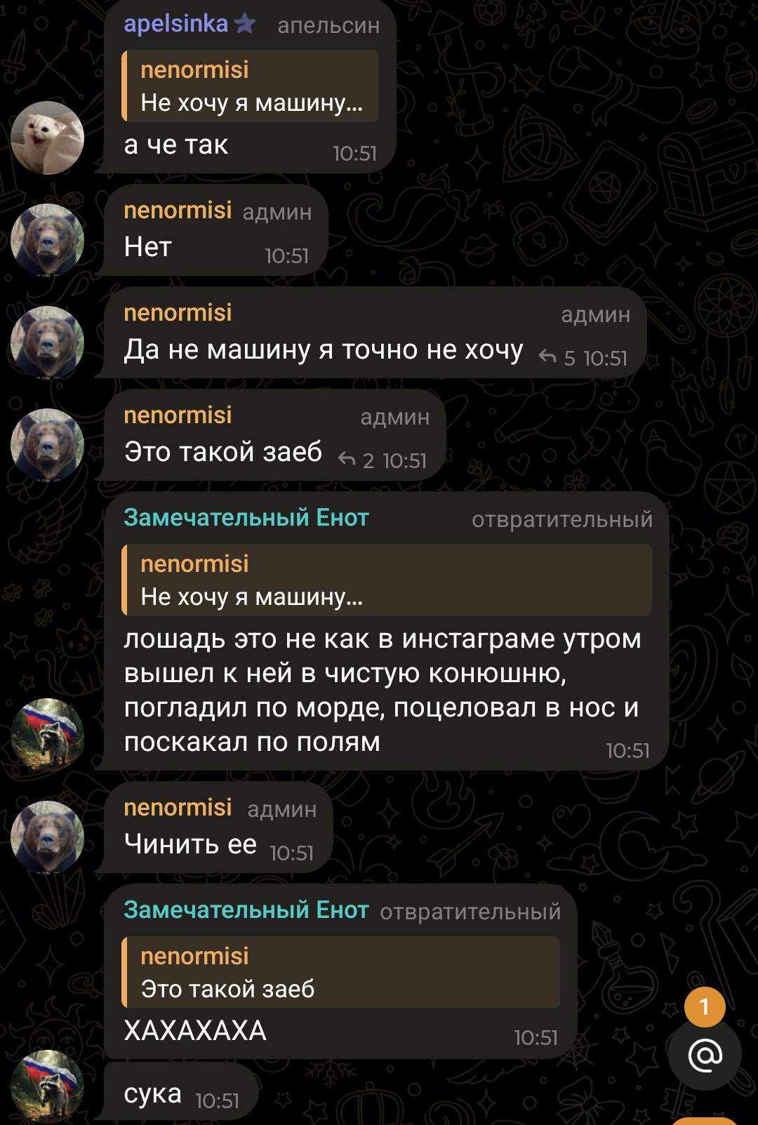 >mr__apelsinka: @otvratitelniy_enot ещё и специально выбрала футболку с широкими руковами в которых до пупка всё видно >mr__apelsinka: КАКАЯ ЖЕ ВСЕ-ТАКИ РАЗВРАТНАЯ ФУТБОЛКА... >mr__apelsinka: УЛЯ А ТЫ МОГЛА ВЫБРАТЬ ФУТБОЛКУ В КОТОРОЙ НЕ ВИДНО ПОЛ ТУЛОВИЩА КОГДА РУКИ ПОДНИМАЕШЬ? @nenormova >mr__apelsinka: СОВЕТУЮ ПРОТЕРЕТЬ РУЧКУ КРАНА, ОН ЯИЧНЫМИ РУКАМИ ЕЁ ПОДНИМАЛ И НЕ ПРОТИРАЛ ПОСЛЕ ЭТОГО >mr__apelsinka: РЕБЯТ ЧТО МОЖЕТ БЫТЬ НАРЯДНЕЕ, ЧЕМ ФУТБОЛКА ЧЕРЕЗ КОТОРУЮ ПОЛ ТУЛОВИЩА ВИДНО КОГДА ОНА РУКИ ПОДНИМАЕТ >mr__apelsinka: СВОЗИ ЕГО В ГОРЫ, ОН ЖЕ В МСК ЖИЛ >mr__apelsinka: СВОЗИ ЕГО В БОБРОВЫЙ ЛОГ. У ВАС ТАМ ЕСТЬ УЖЕ СНЕГ ИЛИ НЕТ?