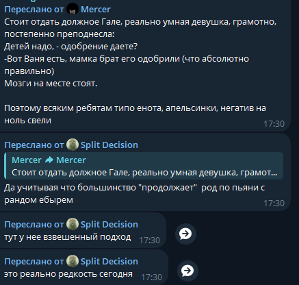 Мне жаль Ивана, без иронии. Он такой мальчик-колокольчик, наверняка у него в голове уже свадьба, дети, общее имущество и счастливая старость. А она прыгнет на первый же хуй в СПБ, когда напьется. Вот в чате у нее писали что он урод и ее недостоин. А по мне она ему не подходит. Такие как она не остепеняются ни в 30 ни в 40. Опрокинет она его через хуй очередного казаха/узбека/таджика.
