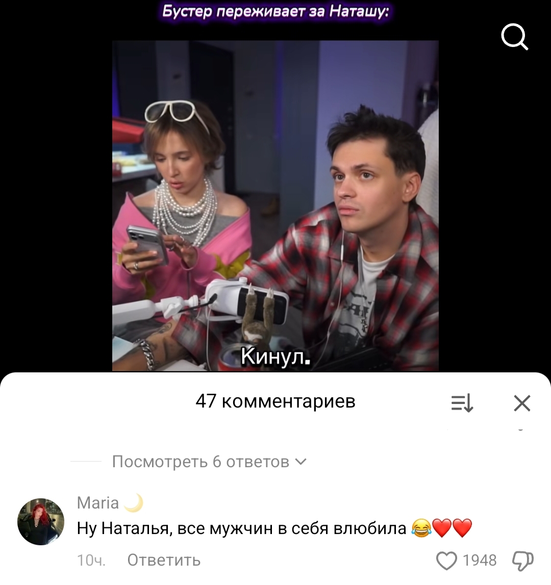 А, Наташа реально лайкает шип эдиты с Бустером, думал чел вкинул вчера, ну понятно короче. Не знаю как вы, но я все же хотел увидеть их с Вадимом вместе снова, но как есть уже. По Вадиму было сегодня видно, что его задели эти стримы со Славой, он чисто из-за того что обещал этот «конфликт» позвонил ей, как будто на отъебись общался, да и в конце стрима на её сообщение в чате ответил не очень то и дружелюбно.