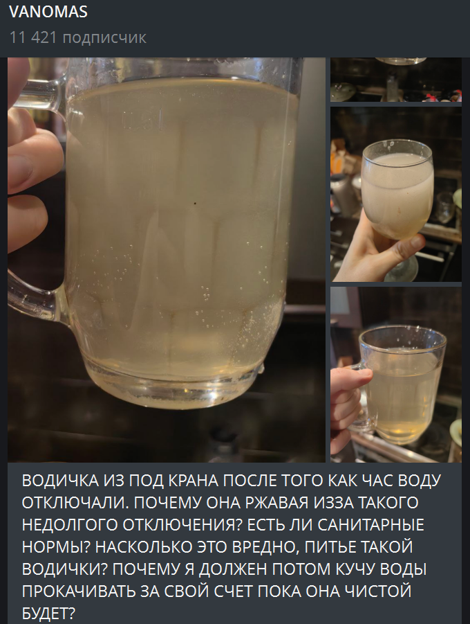 Это классическая ситуация после отключения воды: мутная, рыжевато-коричневая (иногда серая) вода из крана. Почему она такая даже после короткого отключения (1 час)? Это не обязательно ржавчина в чистом виде, а смесь: Мелкая ржавчина и окалина (Fe₂O₃ и другие окислы железа), которая отвалилась от внутренних стенок старых стальных или чугунных труб, когда давление упало до нуля и потом резко подскочило. Марганец и другие отложения — часто дают сероватый или бурый оттенок. Воздушные пузырьки + взвесь — вода может быть мутной просто от воздуха и мелких частиц, которые поднялись. Даже 30–60 минут без давления достаточно, чтобы в трубах начался процесс отслоения налёта. Чем старше дом и стояки — тем сильнее эффект. Это ржавчина или что-то другое? В 90 % случаев — да, это именно частицы ржавчины и оксидов железа. Иногда добавляется марганец (тогда цвет ближе к серому или чёрному). Если вода пахнет тухло, может быть ещё и биоплёнка поднялась. Насколько вредно пить такую воду? Одноразово ничего страшного не случится. Железо в таких концентрациях не токсично (мы и так получаем его с едой). Регулярно нежелательно: избыток железа и марганца плох для печени, почек, может давать проблемы с кожей, волосами, зубами (налёт), плюс вкус отвратительный. Если вода сильно мутная лучше не рисковать, особенно детям и беременным и людям в стадии дожития. Почему я должен за свой счёт «прокачивать» воду? К сожалению, по закону ты обязан платить за весь объём, который прошёл через счётчик, даже если это мутная вода после аварии. Это несправедливо, но так работает почти везде в СНГ. Некоторые люди в таких случаях пишут заявление в водоканал/управляющую компанию с требованием перерасчёта (прикладывают фото и видео). Иногда удаётся отбить хотя бы часть денег, но это лотерея. Сколько нужно сливать и что эффективнее, сливать или ждать? Сливать нужно обязательно, просто ждать бесполезно — вся эта грязь уже в твоём стояке и квартирных трубах. Обычно хватает 5–15 минут мощного слива холодной воды (открыть кран на максимум). Горячую лучше не трогать вообще, там ещё больше отложений. Если после 10–15 минут всё ещё рыжая, значит, грязь идёт из магистрали, тогда может потребоваться от получаса до нескольких часов (иногда до суток в старых домах). Практические советы: Сливай сразу на максимальном напоре, чем быстрее поток, тем лучше вымывает частицы. Сначала холодную, потом горячую. Поставь ведро или тазик - увидишь, когда вода станет полностью прозрачной. Если есть фильтр-кувшин, после того, как вода стала визуально чистой, ещё первые 10–20 литров лучше профильтровать или отстоять. Короче: это нормальное явление, не яд, но и не полезно. Сливай минут 10–15 за свой счёт, другого выхода нет.