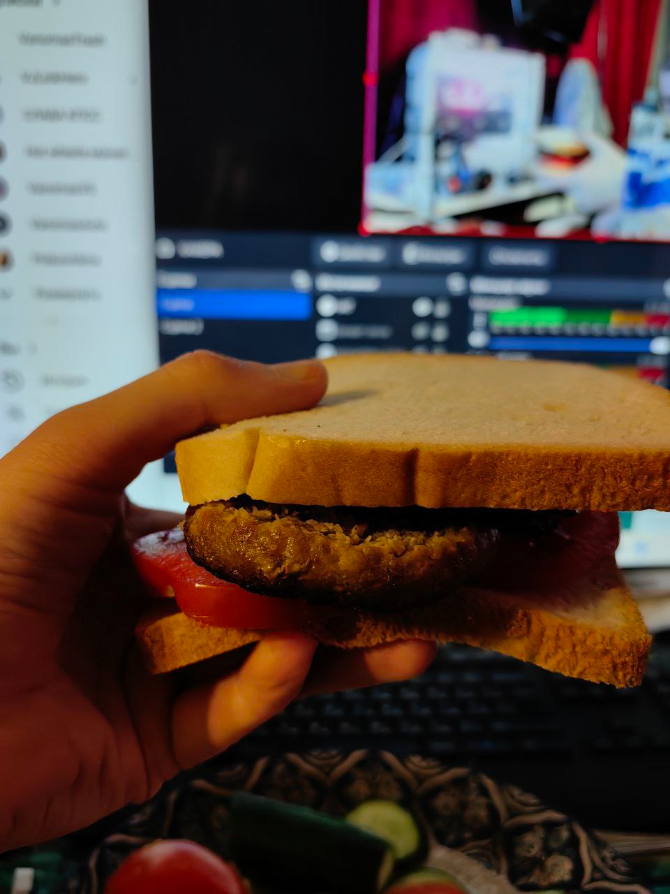 Там это, на стриме незаметно произошло приготовление "бургера маслакова": бомж притащил продукты в комнату, там же их нарезал за кадром, получился обычный бутер с хлебом. Всё.