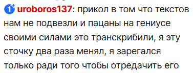 >>25716866 > Нихуя, для неё россия скорее 34 была Возможно и была, но прошла мимо. Получилось наоборот что тем кто дрочил лор славы было интересно восполнять пробелы, а неофиты жаловались что слишком душно и не интересно слушать про славу > нарочито банальные строчки пишет Он сейчас так и пишет. Потому что перенял это у буды. Он сам говорил после антихайптрейна что его заебало перегруженные тексты исполнять на концертах, да и сочинять думаю тоже. С того момента пошло упрощение и всратые панчи через БУДТО, КАК по пятьсот раз за трек > олды и так знали из всяких интервью например, за исключением пары треков. Причем он сам обосрался с последовательностью событий. Он у вписки ошибся сказав что орехов леша умер после баттла с окси > Пацаны вообще кринж, издевка над пацанской темой. Бля ну вот я не увидел издевки. Это реально всратый трек. Ну это наверное настоящая постирония на грани. Пацаны пацаны. Петь о важных личных вещах в стебной манере. Чтобы довести до грани надо было в таком же стиле трек про батю сделать. Там бы у флома крышу совсем снесло в попытках понять это рофл релиз или нет
