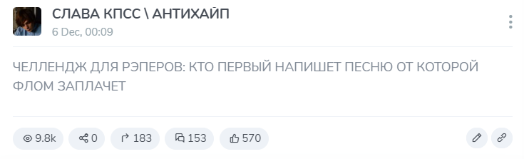 Все. Ру реп кончился. Даже патрули у кирилла ну средненькие. А до этого было одно говно и дальше будет то же говно для солевых из тиктока. Слава теперь на автомате пишет на похуях, буда к тому же подсобил как фристайлить пустые тексты. Все уже. Славе остается доить аудиторию из манекенов фитами с хайповыми мазеловыми и прочим калом. Вот он, прайм. Антихайп кончился на антихайптрейне, как и обещалось. Прощай антихайп мой, я помню эти цифры 5 : 0. Теперь только доилка денег пока еще форсишься плюс минус неплохо и остепенившаяся жизнь с жопичем младшим. И говно эксперименты с подачи нетакуськи Куромыши типо Соломы и психоделических песен с ГОЛЫМ МУЖИКОМ И КИНДЕР БУЭНО))) НЕ ВСЕ ПОЙМУТ))) Только эти эксперименты говно по умолчанию если тебе нечего сказать. Это то же самое говно которое он подает под обычной оберткой в своем стандартном репе, но теперь перекрученное чтобы казалось необычнее. Только это все равно пустота. Творческий ноль.