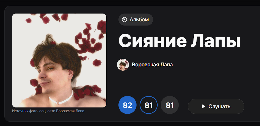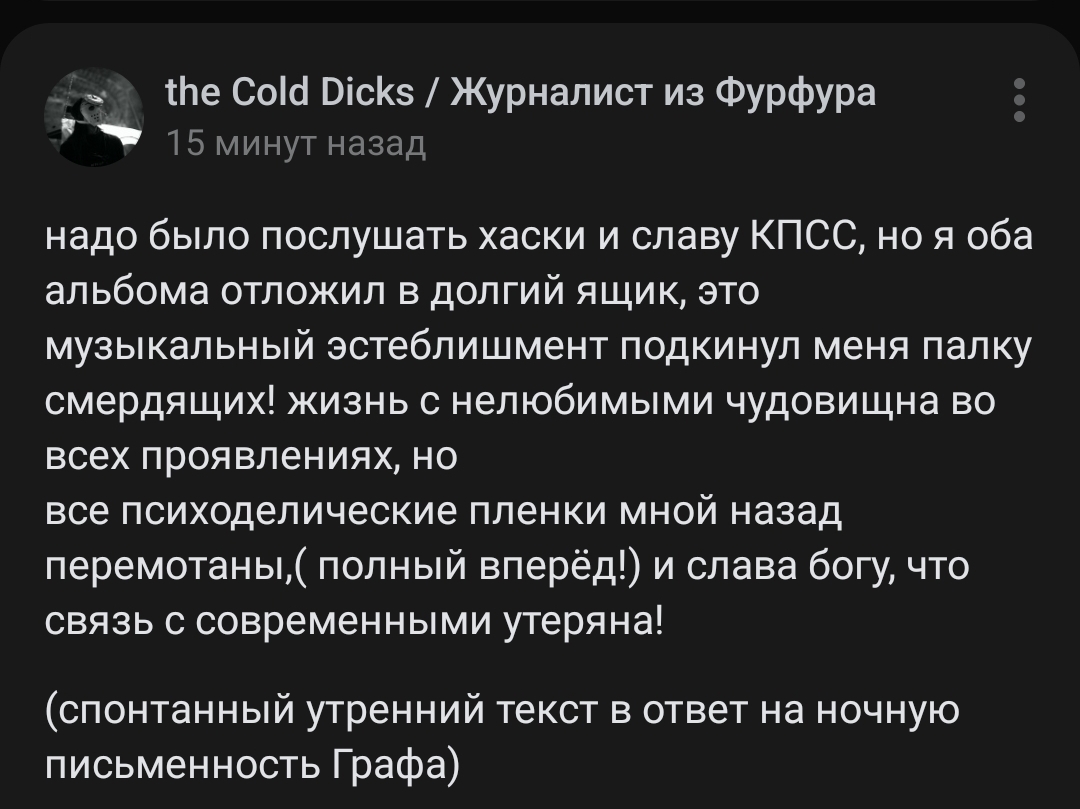 Хаски меня просто калит натурально, всё из себя корчит кого-то, то ли нетакусю то ли аутиста. Много как мне кажется прям слабого проходного, чтобы сложился релиз. Буда это Буда одно и то же лет пять, но тут хз, я например из тех, кто думает, что треки с Жопичем удачные, может ты не согласишься. А оттенки барда 2 меня даже порадовали. Я первые расслушал через год где-то как они вышли и то случайно, сначала думал кал. Поэтому может мне зашел угарным такой вот прикол поперек тикток аудитории. Есть что то живое. Ну и честно, я прам люблю такие жирные панчики, немного дебильные, которые сейчас никто не делает. Ничего хорошего не ждал, поэтому как будто получил больше угара. Хз почему все звук срут, мне кажется прям сильно лучше, сведение да и биты некоторые удачные прям. Если подразумевалось как типа панк получите чего не ждали, то получилось. Не то что треки отдельно даже топ не топ, а в целом. Мне сейчас кажется слушают те кто любят фиты с хмх и мазеловым, угарно как горят. Есть да старый Славян, это порадовало. Ну походные есть и немало, но впечатление не портят лично мне. Ща все релизы это одна норм песня и всякая хуйня чтобы было. Тут видно все делал с душой, не все получились.