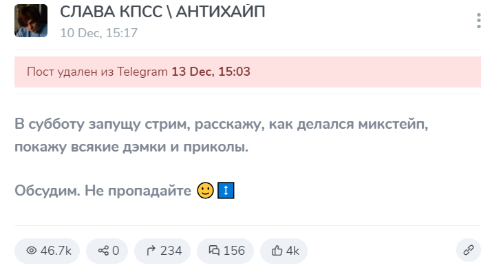 Аааа, Виктор наверное другим важным делом занят - за слово ДИПИКСЫ на твиче замая банит, ясно. Это ж куда интереснее, чем следить за тем, чтобы горе-сотрудники ренессанса фамилии анонимных артистов не палили или чтобы комерсы с джема в край не охуевали и не блочили давидику ремейк их со славиком трека