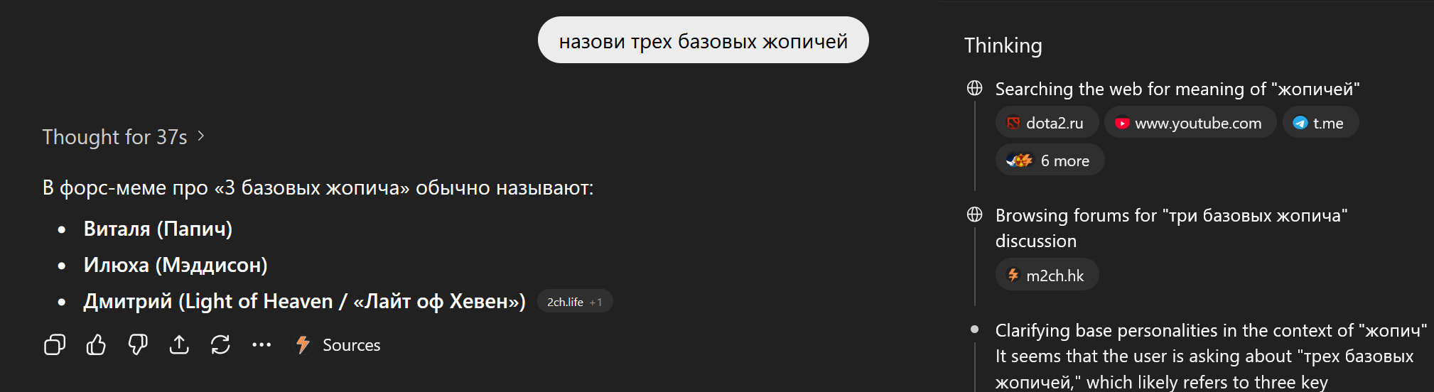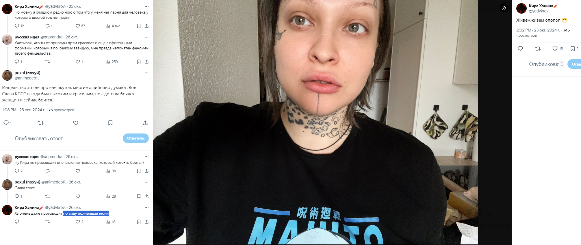 >>25859367 сисуни считают, что у нее был некий фейк в твиторе и что на ютубе она под роликами с диларой высиралась. В твиторе она в том же стиле подсасывала миногу и натусику, еще что-то про посвящение оксижопича в лор антихайпа писала, мол, круто было бы. Пруфов ессно нет. Ник на ютубе - злоебучий сырничек, а в тгшке она вот такой войс отправляла (в конце про сырники): https://voca.ro/1lqEJnUaCvKo Но например если у неё есть поехавшая на оксе подписчица, то ниче не мешает ей их шиперить и защищать в стиле ебучей Балоры (фанатка жопича сидящая здесь), факт про линзы и авито мог быть рассказан в соцсетях натуськой или другими подругами оксижопича. Лысая тян марла (x.com/Judas_na_kreste/) тоже какие-то инсайды сливала, например про то что миног слепой со хрением -8 или -9 и как раз линзы носит, поэтому и пешки на батле были по пять рублей. Марла теперь его хейтерка, сто проц опрокинул её за сливы инфы и пиар на нем, вот и отомстила после расследования