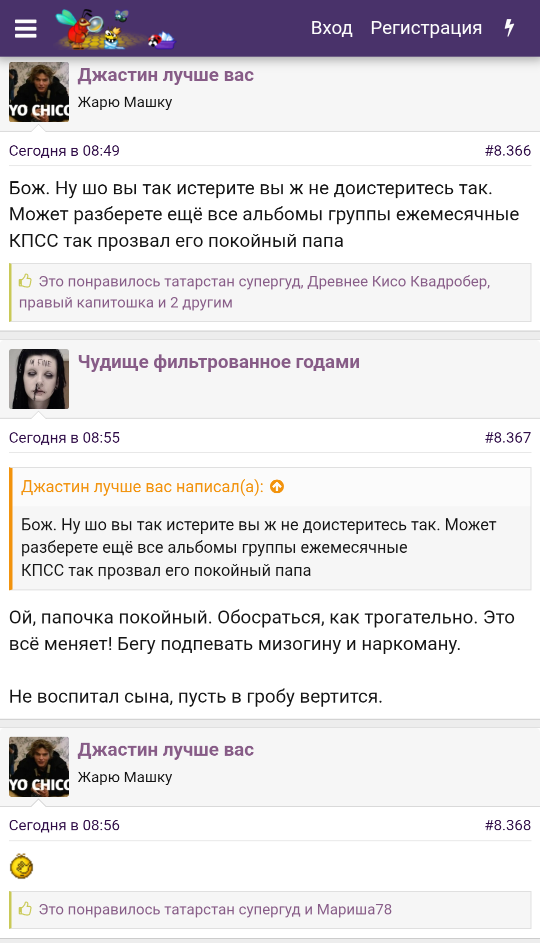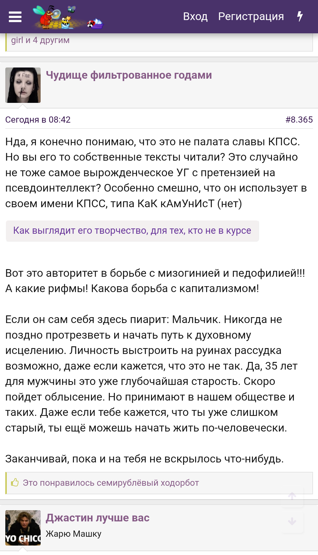 >>25814280 >над слушателями которого и им самим адекватные люди потешались ещё в 2011 году ну если для тебя адекватные люди - это подписчики мдк, это многое о тебе говорит, ты поди еще и над форсом водолаза угораешь витя ака легенда, самобытный и не лишённый самоиронии карл