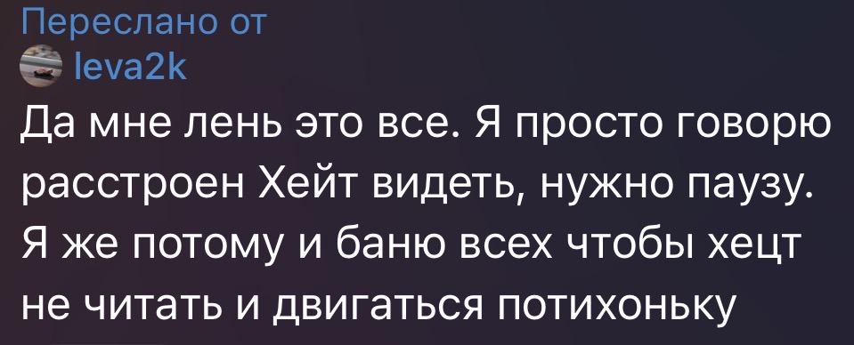 А в чем смысл такого огромного хейта Левы? Просто удивляюсь, что какой-то адекватная критика перешла в угрозы, желания сломать жизнь и тд. Не все смотрю, но в курсе основного контента. Не замечал каких-то ужасных действий с его стороны. Довольно адекватный на фоне ру-стримеров. За то, что в чем-то нарушил правила своего же эвента? А не легче тогда просто не смотреть его и все? Просто у его хейтеров уже какая-то мания, им скорее нужно сходить самим провериться к врачу. Человек ответит не только за злые действия, но и за каждое праздное слово. Надеюсь, что сердца хейтеров станут мягче и они найдут другой способ выплеснуть свои скопившиеся эмоции. Всем добра.