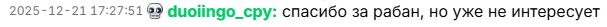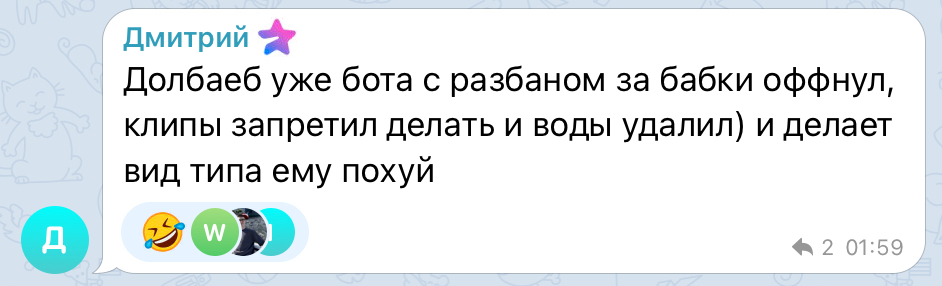 >>25836184 > Так а че толку от этого чата? толк в том, что теперь люди в тг могут в своей собственной конфе обсуждать сблеву так, как они хотят. а не сидеть в его конфе или конфах его подсосов с анальными правилами и массовыми зачистками