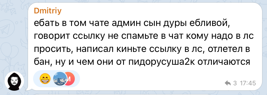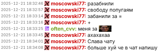 хейтерский чат пал хохлы на админе побанили всех кто чмогуша хотел качнуть за поддержку украины и пингвина забанили который виллу штурмовал плюсом чмогуш начал разбанивать всех