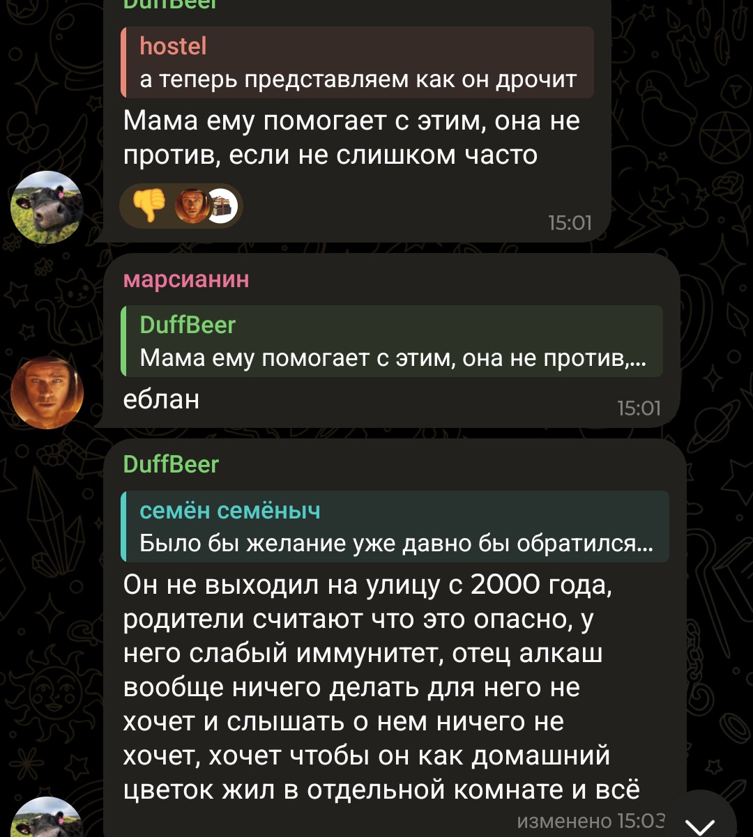 >>25853537 Меня позвали бабы, с которыми ровные отношения в пятницу 26-го, ессно, никуда не пойду, пушто не хочу скидываться на уёбищный рестик с бабами! Лучше сам себе вкусняшек накуплю, выгодней получится! И ваще я выпал из КАЛлектива, когда отказался "чмакс" устанавливать. Хотя на днюху мне собрали чуть больш 5 тыщ рублей! То есть почти каждая баба СОТЫГУ на меня выделила, видно воспринимают как забавного и отзывчивого дурачка... Стараюсь вести себя тактично и ни с кем не конфликтую открыто. Внутри, конечно же, НЕНАВИЖУ БЛЯДЕЙ!!1
