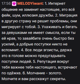 - марк etnerofl и мелоди отпустило обоих, единственные оставшиеся олды, не считая султана, заходят иногда по привычке, но уже не донатят и ничем не занимаются, по сроку стажа заебались уже варится в этой ебатории, они вроде есть, но вроде и нет, по старой сильной любви заходят