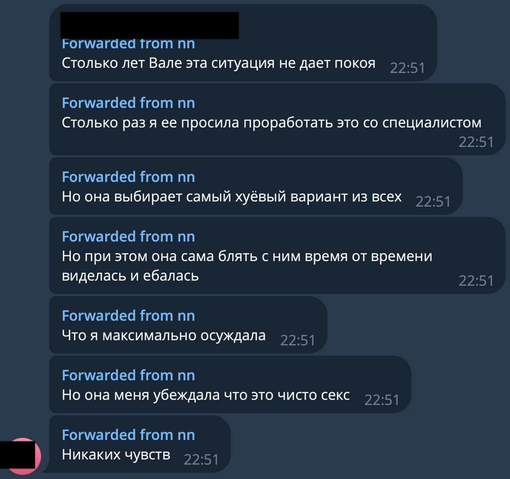 >>25862318 когда похуй, то реально уже похуй, а она сильно хотела выговориться, да так, что стрим правды провела, а значит тема актуальная ещё, в силу её очень ревнивого характера мы теперь все знаем эти подробности, выговорилась, но не без последствий, не учла, что ненормова может пойти в ответку и тоже на грязные подробности перейти и начала в ответ рассказывать, что регулярно ездила к нему в питере на проёб обманывая себя что это просто секс на разок, без чувств. также валя говорила на стриме, что иногда разговаривает сама с собой, диалоги ведёт с бывшим, когда одна дома, убирается, готовит, будто он в комнате, типа шиза такая есть у неё. это сходится со словами ульяны.