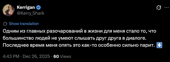 Толстая керри начинает разговаривать с ним. Рассказывает какие все вокруг мудаки и что люди должны уметь договариваться когда не могут согласиться с тем, что она права. А она всегда права.