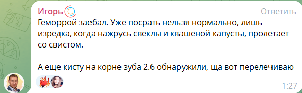> Вас реально задевает когда на вас ссут, харкают в вас или рыгают в ебало? Вы серьезно ребят?! > Ну нельзя же быть настолько соевыми снежинками. > Мы с корешами можем в формате пост-иронии и в рот друг другу насрать и хуёв натолкать и говном друг друга обмазать и блевотню у друг друга сожрать > и представьте никто не обижается. Я даже больше скажу, такие действия только укрепляют нашу дружбу! > > Просто кадавр копрофаг, но ест только своё говно, а значит копрофаг безобидный как наверное и я, поэтому его тип личности мне и близок.