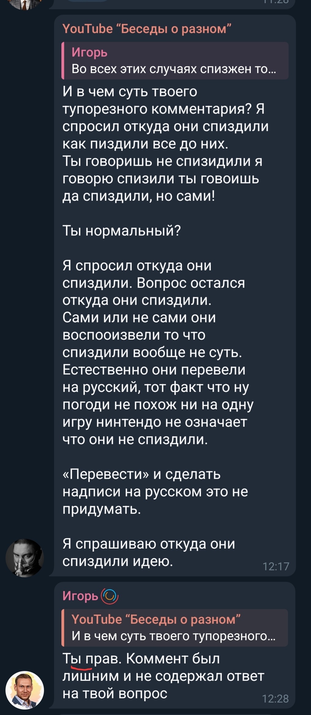 >>25828467 >>25829430 Лол, как же у Сёмы-мочехлеба подгорает, основной посыл униженного сектантика - "не смейте оскорблять моих пиздоглазых хозяев". При чем суть не меняется, алгоритм один и тот же, мочехлеб читает тред-у мочехлеба адски подгорает-мочехлеб пытается остудить сраку воплями "вы хуже рыгающего кнура, я так чуйствую"