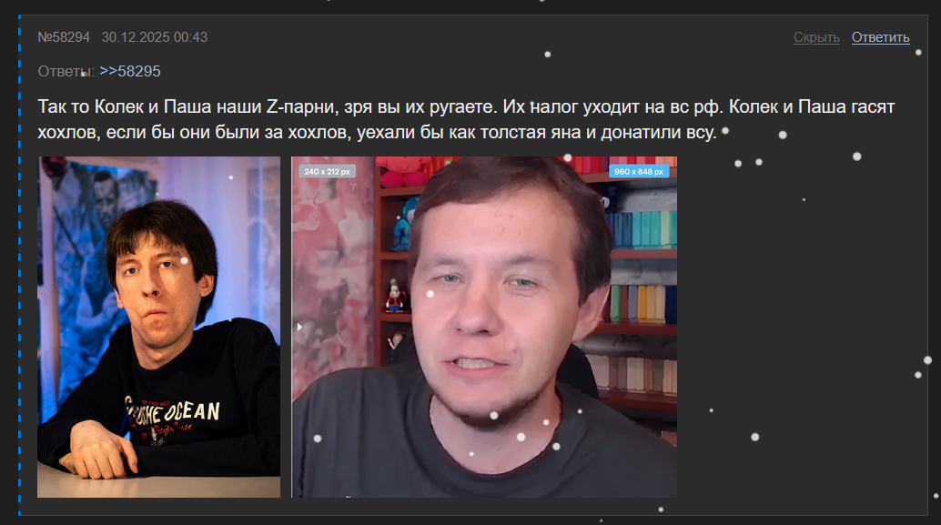 Не заходил в тъед с весны. Это правда, что одного из ферретов усыпили? И правда ли, что Паша сфотографировался на инвалидной коляске? Что нового по Яне? Как там поживает её КРАШ? Кстати, тут недавно Илюха Мэд База на стриме упомянул Кулхарда, Фроззу и Вовика. Но если по первым двум ничего удивительного (он их и так периодически вспоминает + с Фроззой виделся), то вряд ли он может помнить о сельском дурачке по двум совместкам с Кинаманом 150-летней давности. Читает черветред, чертяка.