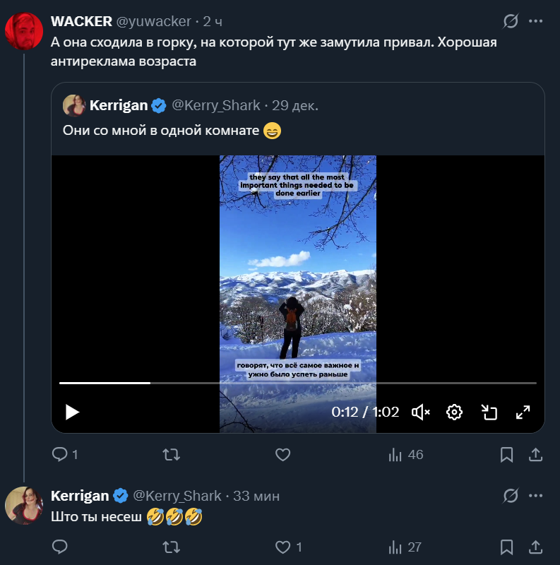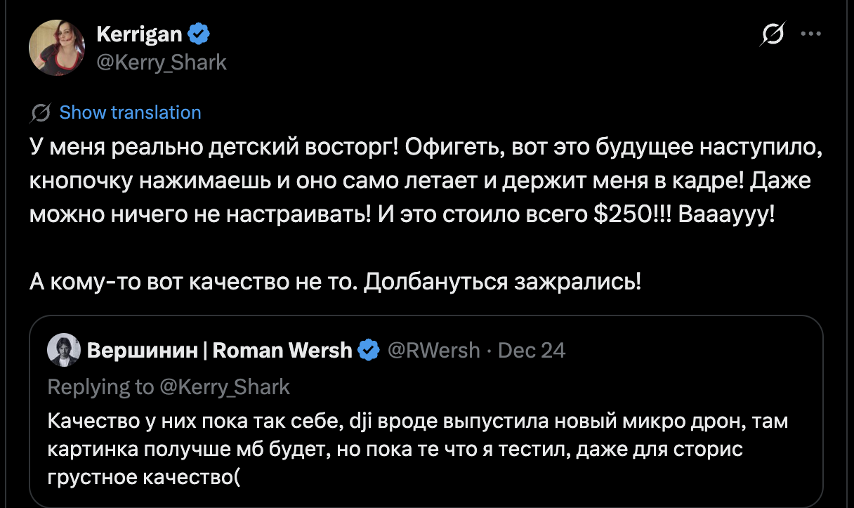 И не высокоранговый твиттерский ей написал, что квадрокоптер говно, камеру у него говно, что он такой же покупал и сдал по причине камера говно. Лысая керри на него накинулась что он зажрался и вообще не шарит, а ей заебись.