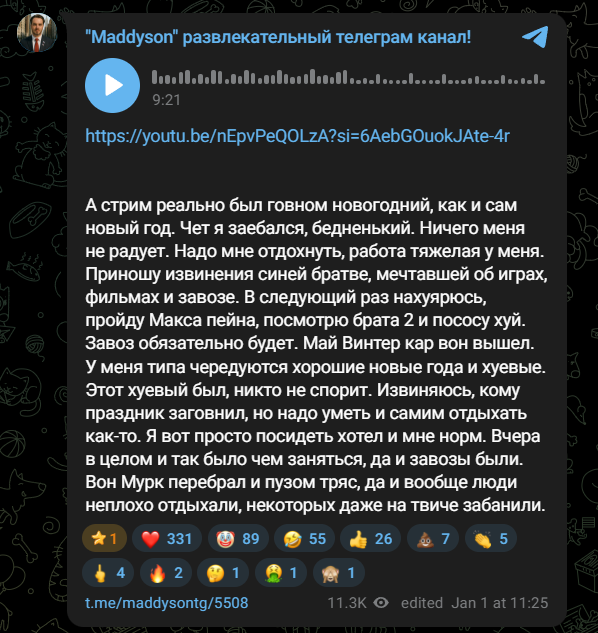 Как-же чмодье нахуярилось после стрима. Я прям и вижу, как он заливался и гыгыкал написывая всю ту хуйню в тг. Ух бля. Ближайший подруб будет в конце января или уже в феврале. Естественно с новой телегой как не задался зожик, но ниче, сейчас чуток задерпим и к концу месяца то точно с новыми силами... И так нахуй по кругу до конца года. Алкашей с таким стажем не передалать.