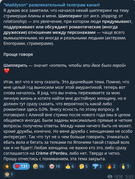 Итак, вот что я хочу сказать. Это душнейшая тема. Помню, что мне целый год выносили мозг этой амурантихой, теперь вот снова началось. Я рад, что вы очень переживаете за мою личную жизнь и хотите найти мне достойную женщину, но я должен тут сразу сказать, что вероятность какой либо романтики здесь 0,0%. Внесу ясность по этому вопросу. Я поговорил с Алиной вне стрима после нового года (мы в целом общаемся иногда). Были заданы максимально прямые и четкие вопросы, получены ответы. Между нами ничего быть не может, кроме дружбы, конечно. Но меня дружба с женщинами не особо интересует. Так что тут не о чем больше говорить. Унижаться, ебать вола и бегать за телками по Япониям такой старый волк как я не будет! Любая женщина, не важно кто это, либо сразу соглашается на Crème d’Perdeu, либо нет. Твердо и четко. Прошу отнестись с пониманием, эта тема закрыта.