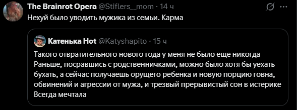 Антихайпики, привет! Увидела на канале Михи репост депрессивного сообщения Мэда и заплакала. Этот нг снова одна буду встречать, все дни перемешались в один серый и скучный. Завтра опять на нелюбимую работу. Очень грустно на душе сейчас. А кто-нибудь из вас счастлив?
