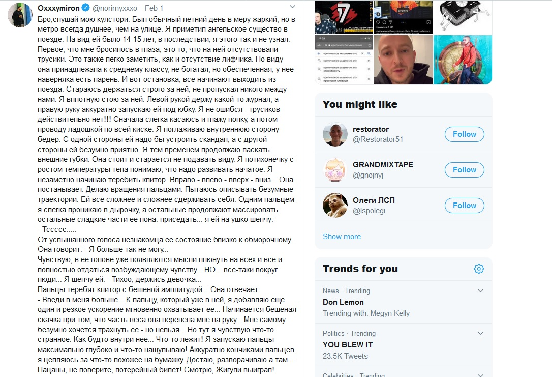 >>25916248 Насчет порвать жопы хз, мне кажется просто угарчик какой-нить нужен, форс весёлый, МЭМ. Ну вот тот самый подписчик куромы в тиктаке блог ведёт если он это читает, то можно продвинуть какую-нить конспирологическую теорию например, они в одном из прошлых тредов есть Чем больше странных слухов и фактов, тем для артиста лучше